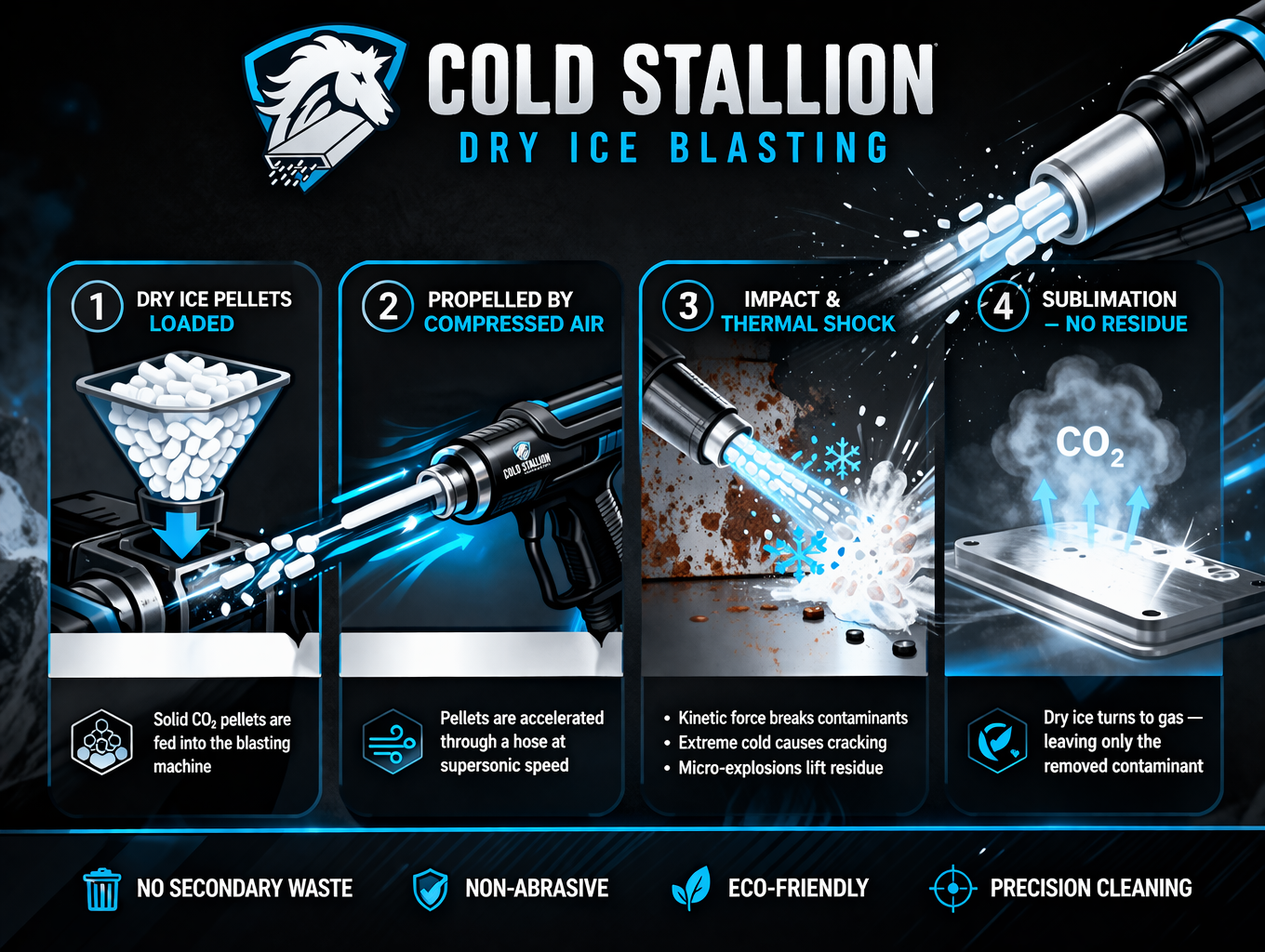 Dry ice blasting is a cutting-edge cleaning technique and removes contaminants using compressed air and CO₂ pellets, leaving surfaces clean, dry, and undamaged—without water or chemicals.